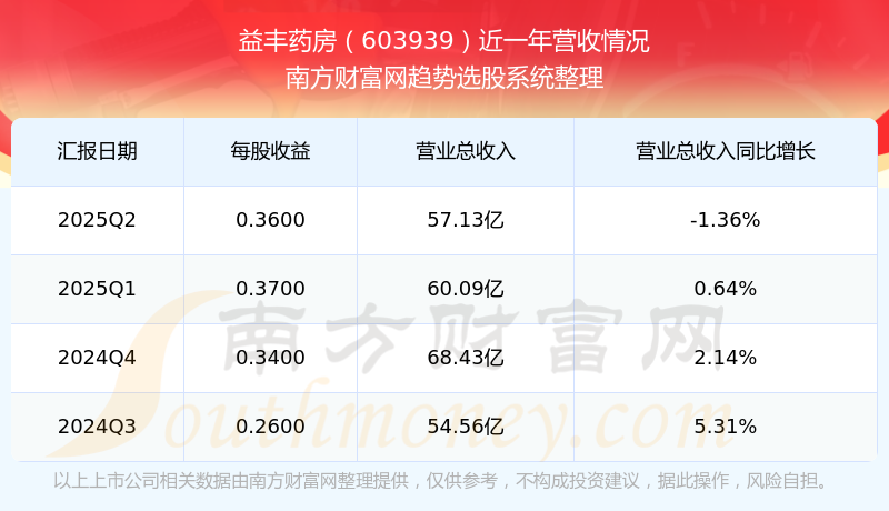 益丰药房2025年第二季度财报显示,公司主营收入57.13亿元,同比-1.36%;归母净利润4.31亿元,同比10.13%;扣非净利润4.19亿元,同比8.49%。