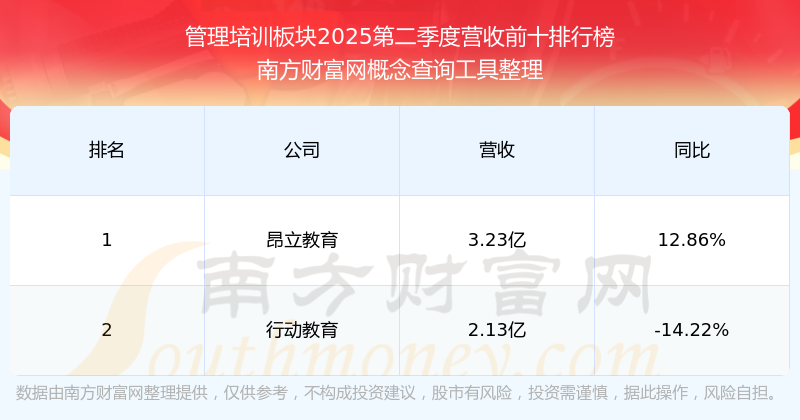 按照南方财富网概念查询工具统计,该股所属板块为管理培训板块,该板块共有2只股票,行动教育2025第二季度营收在该板块中排名为第2名,该板块2025第二季度营收排名前十的股票如下表: