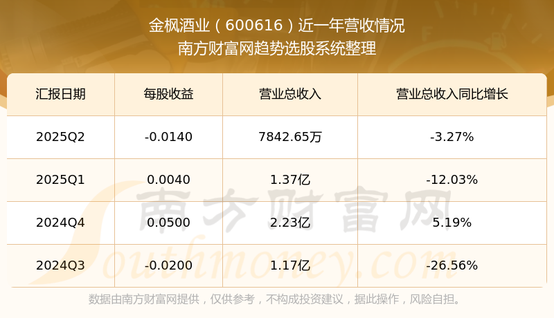 财报显示,2025年第二季度金枫酒业营收7842.65万元,同比增长-3.27%,净利润-997.63万元,同比增长45.4%。