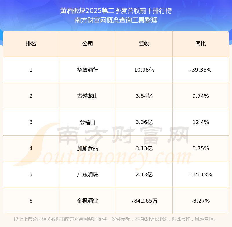 按照南方财富网概念查询工具统计,该股所属板块为黄酒板块,该板块共有6只股票,金枫酒业2025第二季度营收在该板块中排名为第6名,该板块2025第二季度营收排名前十的股票如下表: