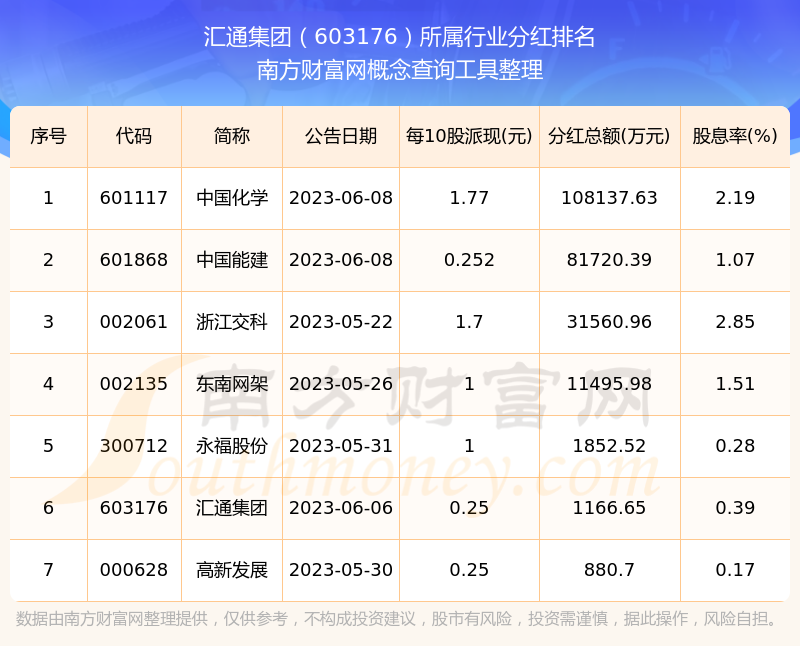 按照南方财富网趋势选股系统统计,汇通集团所属行业为工程建设行业,工程建设行业分红排名情况如下表: