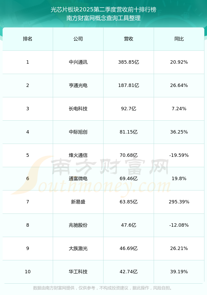 按照南方财富网概念查询工具统计,该股所属板块为光芯片板块,该板块共有40只股票,仕佳光子2025第二季度营收在该板块中排名为第30名,该板块2025第二季度营收排名前十的股票如下表:
