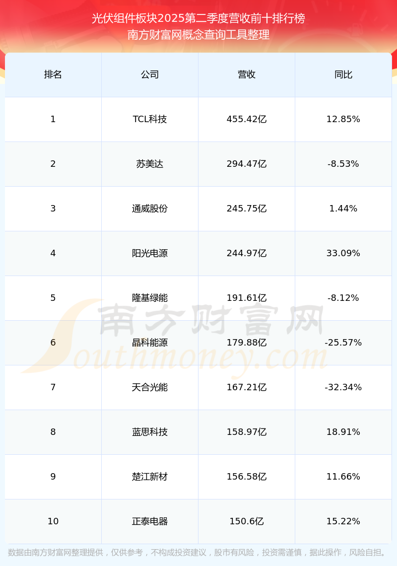 按照南方财富网概念查询工具统计,该股所属板块为光伏组件板块,该板块共有109只股票,天合光能2025第二季度营收在该板块中排名为第7名,该板块2025第二季度营收排名前十的股票如下表: