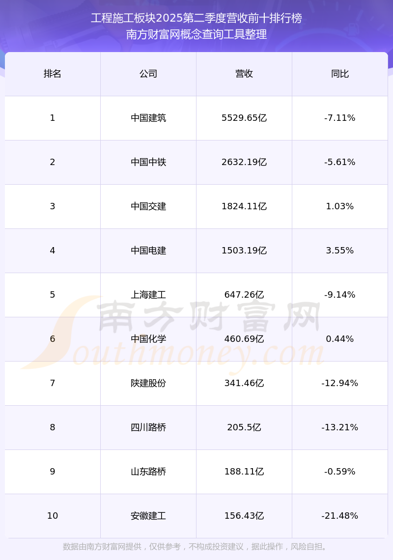 按照南方财富网概念查询工具统计,该股所属板块为工程施工板块,该板块共有56只股票,亚翔集成2025第二季度营收在该板块中排名为第31名,该板块2025第二季度营收排名前十的股票如下表: