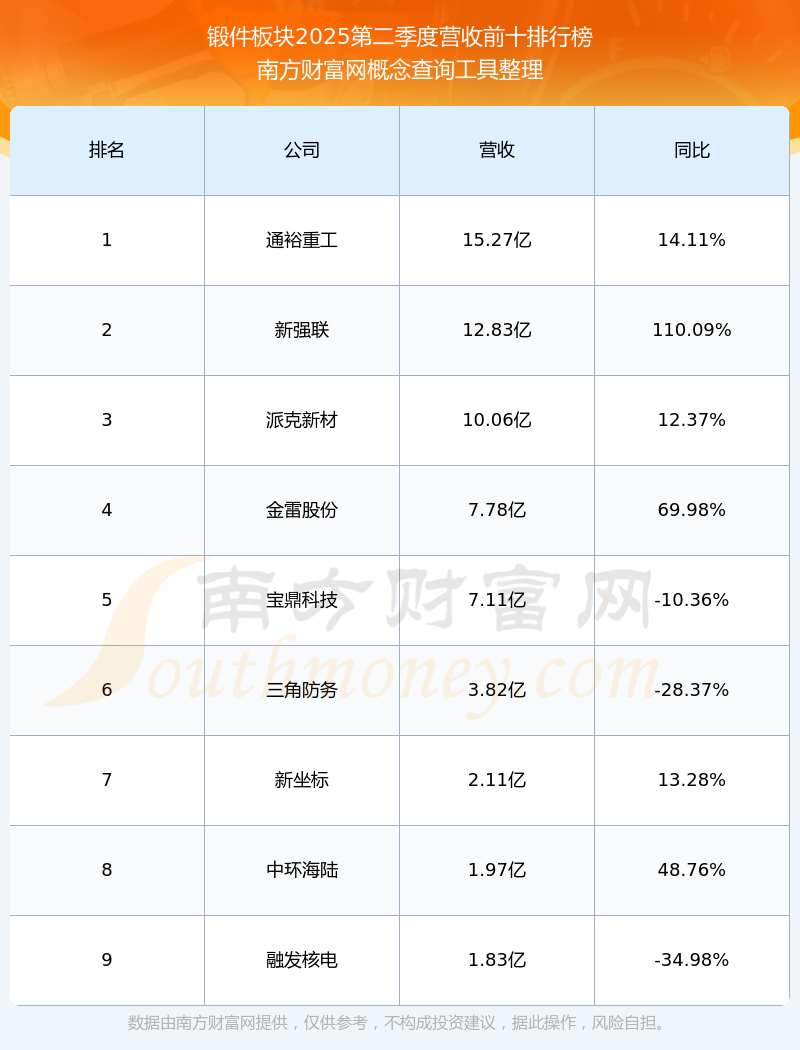 按照南方财富网概念查询工具统计,该股所属板块为锻件板块,该板块共有9只股票,航宇科技2025第二季度营收在该板块中排名为第9名,该板块2025第二季度营收排名前十的股票如下表: