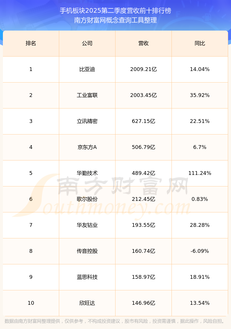按照南方财富网概念查询工具统计,该股所属板块为手机板块,该板块共有137只股票,传音控股2025第二季度营收在该板块中排名为第8名,该板块2025第二季度营收排名前十的股票如下表: