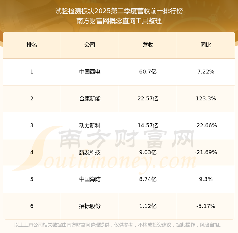 按照南方财富网概念查询工具统计,该股所属板块为试验检测板块,该板块共有6只股票,南网科技2025第二季度营收在该板块中排名为第6名,该板块2025第二季度营收排名前十的股票如下表: