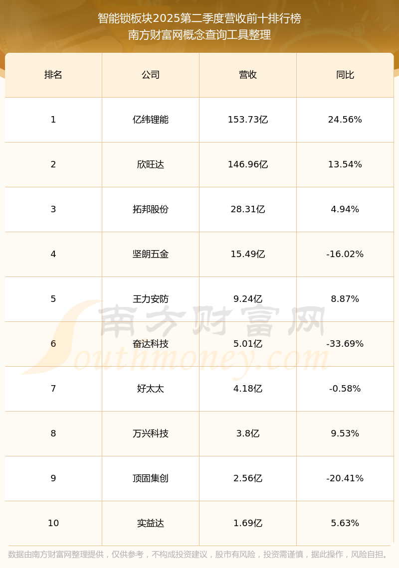 按照南方财富网概念查询工具统计,该股所属板块为智能锁板块,该板块共有13只股票,王力安防2025第二季度营收在该板块中排名为第5名,该板块2025第二季度营收排名前十的股票如下表: