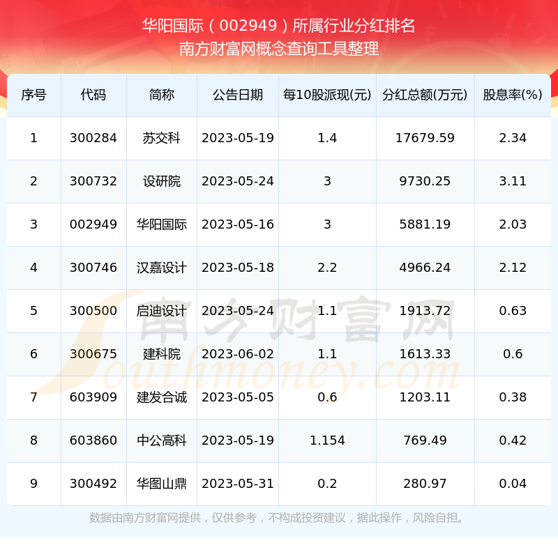 按照南方财富网趋势选股系统统计,华阳国际所属行业为工程咨询服务行业,工程咨询服务行业分红排名情况如下表: