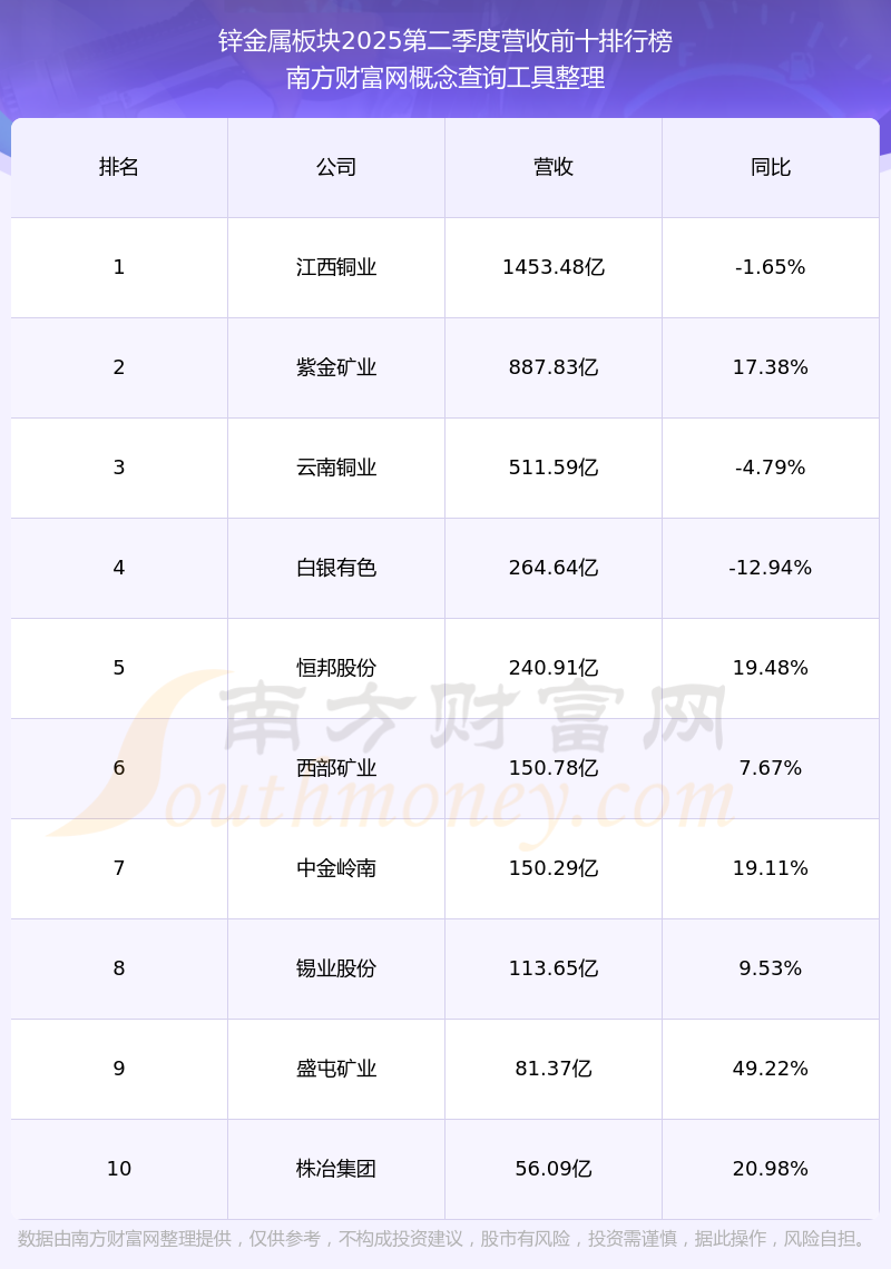 按照南方财富网概念查询工具统计,该股所属板块为锌金属板块,该板块共有29只股票,宏达股份2025第二季度营收在该板块中排名为第21名,该板块2025第二季度营收排名前十的股票如下表: