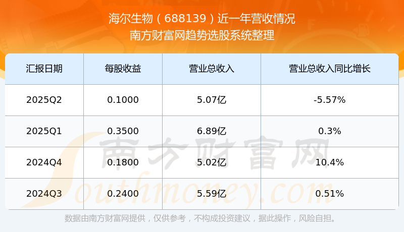 海尔生物股票近一年营收情况如下表: