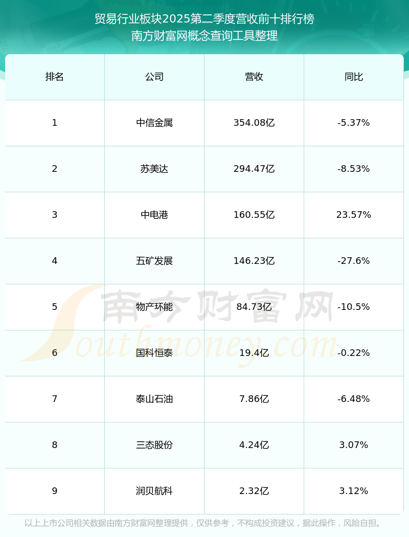 按照南方财富网概念查询工具统计,该股所属板块为贸易行业板块,该板块共有9只股票,庚星股份2025第二季度营收在该板块中排名为第9名,该板块2025第二季度营收排名前十的股票如下表:
