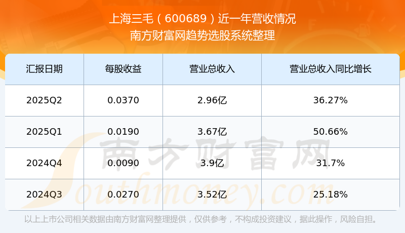 在2025年第二季度,上海三毛的业绩表现,主营业务收入达到2.96亿元,实现了36.27%的同比增长率。同时,公司归母净利润录得757.87万元,同比增长31.4%。