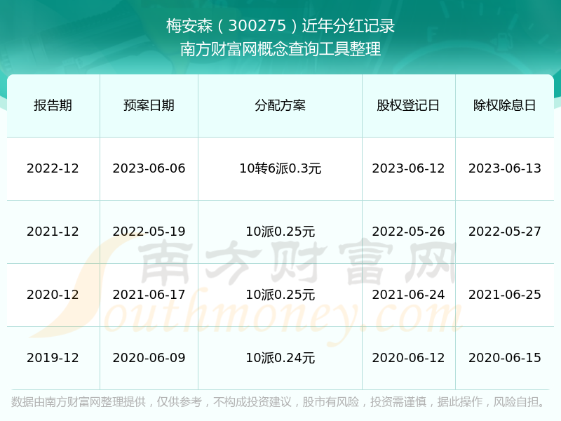 梅安森最新一次公布的分红方案为10转6派0.3元。本次权益分派股权登记日为2023年6月12日,除权除息日为2023年6月13日,派息日为2023年6月13日。