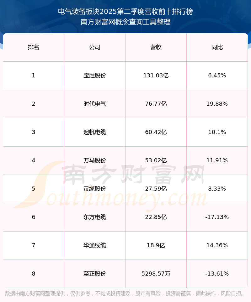 按照南方财富网概念查询工具统计,该股所属板块为电气装备板块,该板块共有8只股票,宝光股份2025第二季度营收在该板块中排名为第8名,该板块2025第二季度营收排名前十的股票如下表: