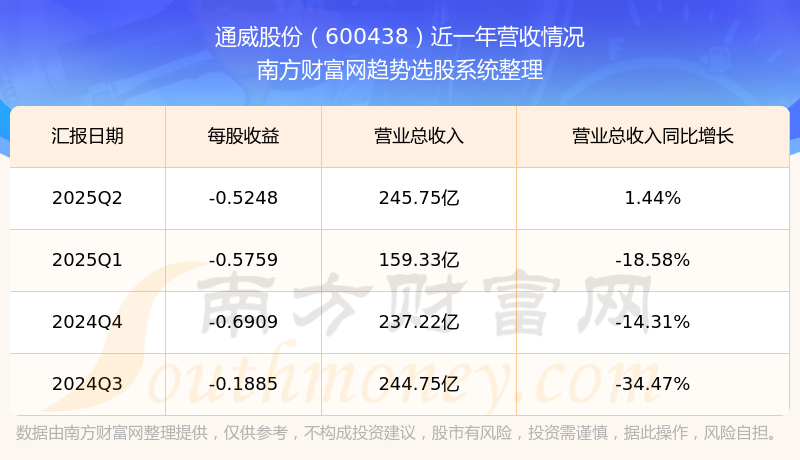 通威股份2025年第二季度公司实现营业收入245.75亿元,同比1.44%;归母净利润-23.63亿元,同比-0.85%。