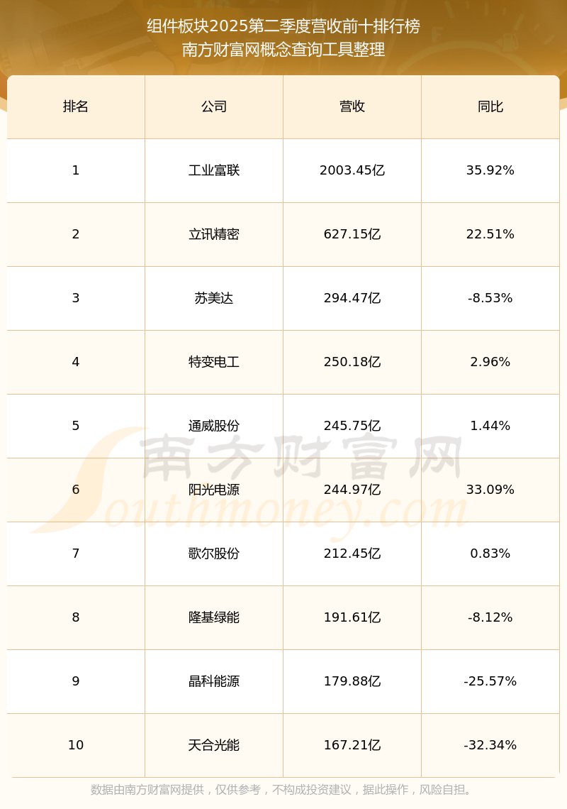 按照南方财富网概念查询工具统计,该股所属板块为组件板块,该板块共有87只股票,通威股份2025第二季度营收在该板块中排名为第5名,该板块2025第二季度营收排名前十的股票如下表: