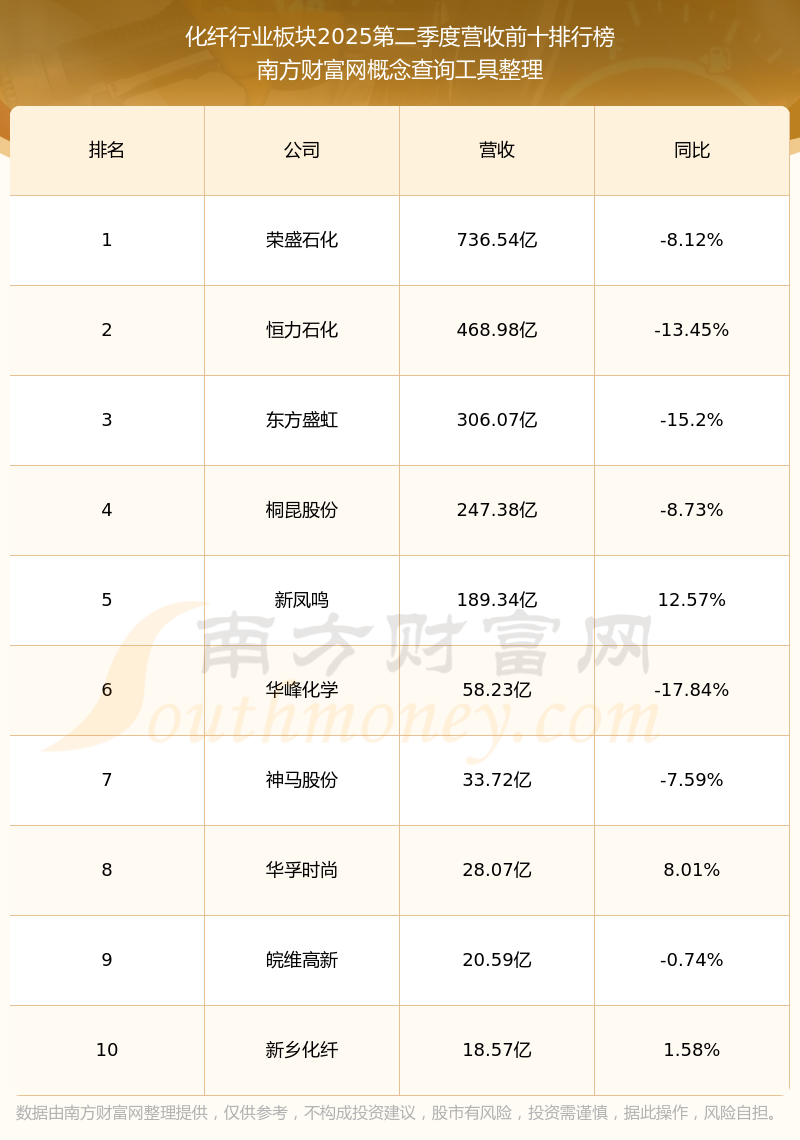 按照南方财富网概念查询工具统计,该股所属板块为化纤行业板块,该板块共有30只股票,华鼎股份2025第二季度营收在该板块中排名为第13名,该板块2025第二季度营收排名前十的股票如下表: