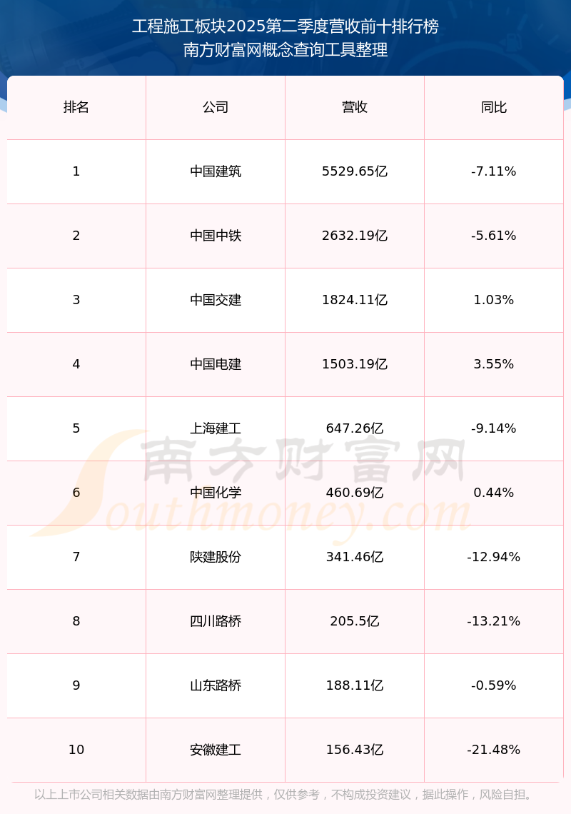 按照南方财富网概念查询工具统计,该股所属板块为工程施工板块,该板块共有56只股票,四川路桥2025第二季度营收在该板块中排名为第8名,该板块2025第二季度营收排名前十的股票如下表: