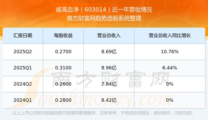 威高血净(603014)发布2025年第二季度财报。2025年第二季度威高血净实现营业收入8.69亿元,同比增加10.76元%,环比增加-3.05%;净利润为1.08亿元,同比增长12.5%,环比增长-3.98%。