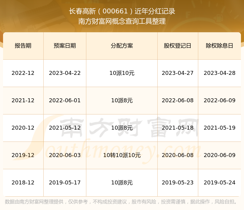 长春高新最新一次公布的分红方案为10派10元。本次权益分派股权登记日为2023年4月27日,除权除息日为2023年4月28日,派息日为2023年4月28日。