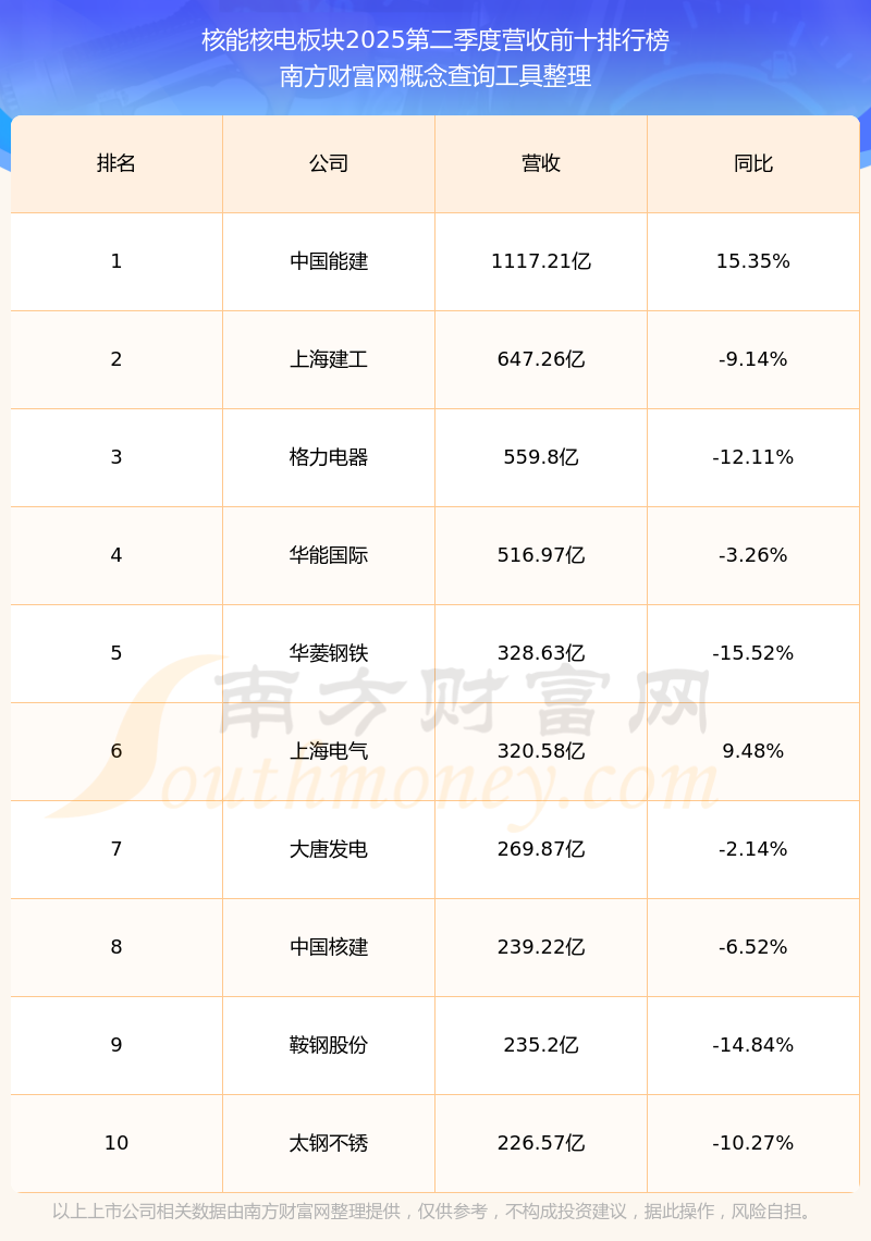 按照南方财富网概念查询工具统计,该股所属板块为核能核电板块,该板块共有172只股票,兰石重装2025第二季度营收在该板块中排名为第69名,该板块2025第二季度营收排名前十的股票如下表: