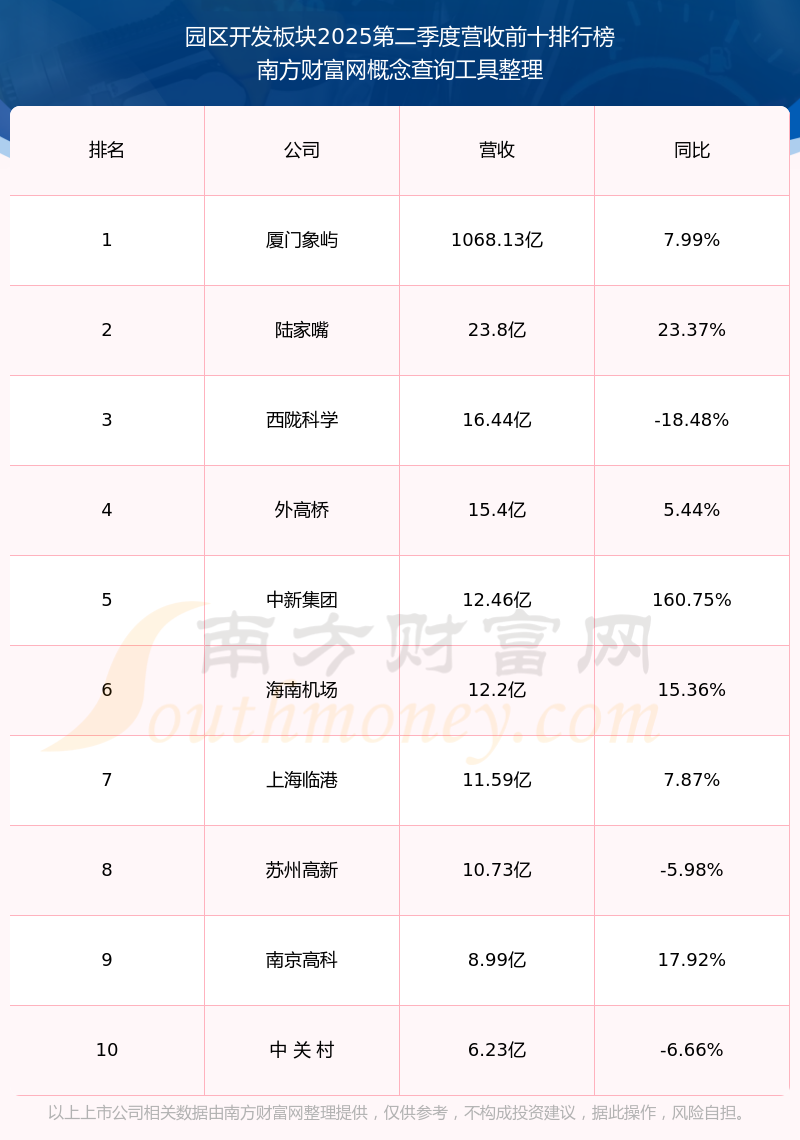 按照南方财富网概念查询工具统计,该股所属板块为园区开发板块,该板块共有24只股票,中新集团2025第二季度营收在该板块中排名为第5名,该板块2025第二季度营收排名前十的股票如下表: