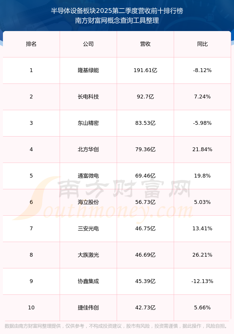 按照南方财富网概念查询工具统计,该股所属板块为半导体设备板块,该板块共有167只股票,屹唐股份2025第二季度营收在该板块中排名为第33名,该板块2025第二季度营收排名前十的股票如下表: