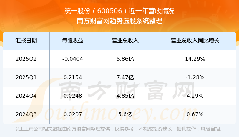 统一股份发布2025年第二季度财报。实现总营收5.86亿元,同比增长14.29%;扣非净利润同比增长55.56%至-859.93万元。