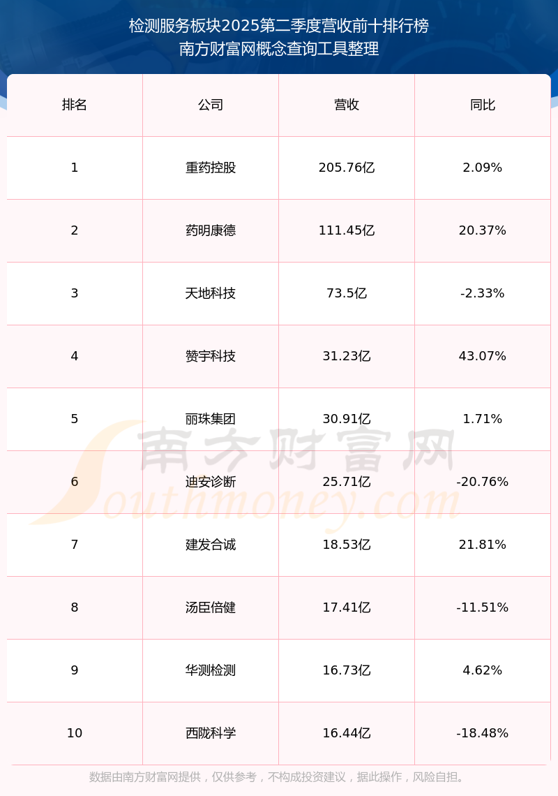 按照南方财富网概念查询工具统计,该股所属板块为检测服务板块,该板块共有53只股票,胜科纳米2025第二季度营收在该板块中排名为第45名,该板块2025第二季度营收排名前十的股票如下表: