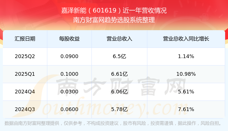 于2025年第二季度,嘉泽新能披露了其业绩表现,其中主营业务收入6.5亿元,相较于去年同期1.14%。此外,公司归属于母公司的净利润为2.2亿元,同比增长了2.44%。在扣除所有非经常性损益后,净利润2.21亿元,同比增长3.3%。