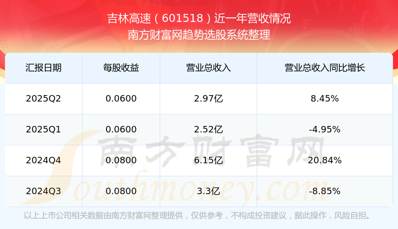 财报显示,2025年第二季度吉林高速营收2.97亿元,同比增长8.45%,净利润1.14亿元,同比增长-8.54%。