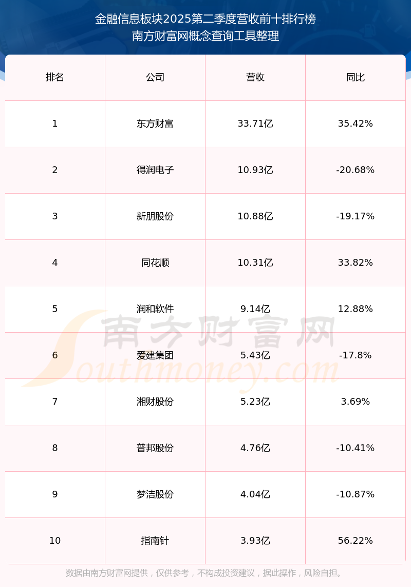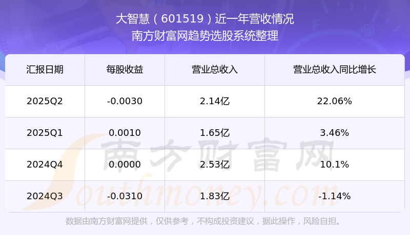 按照南方财富网概念查询工具统计,该股所属板块为金融信息板块,该板块共有19只股票,大智慧2025第二季度营收在该板块中排名为第14名,该板块2025第二季度营收排名前十的股票如下表: