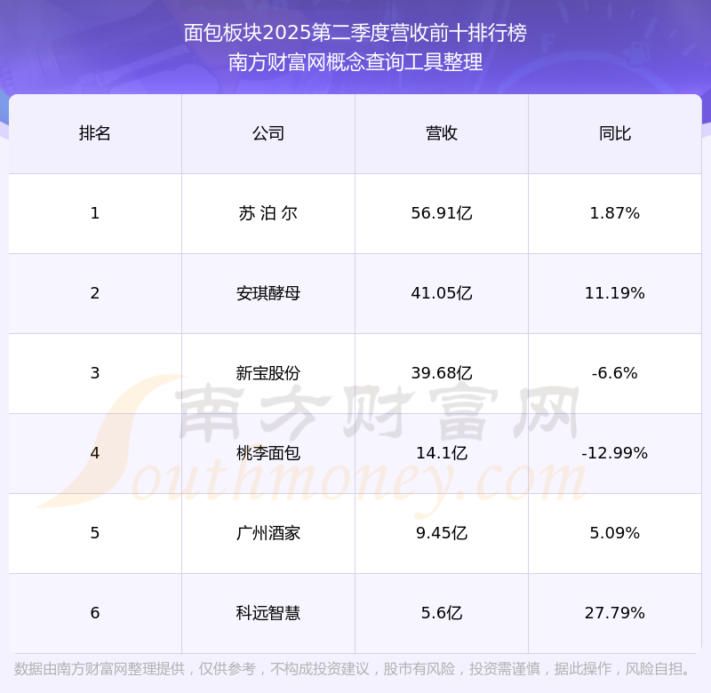 按照南方财富网概念查询工具统计,该股所属板块为面包板块,该板块共有6只股票,桃李面包2025第二季度营收在该板块中排名为第4名,该板块2025第二季度营收排名前十的股票如下表: