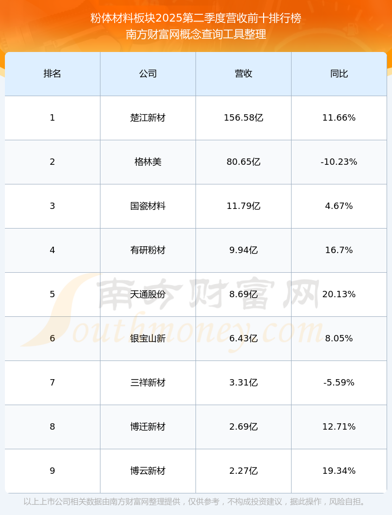 按照南方财富网概念查询工具统计,该股所属板块为粉体材料板块,该板块共有9只股票,有研粉材2025第二季度营收在该板块中排名为第4名,该板块2025第二季度营收排名前十的股票如下表: