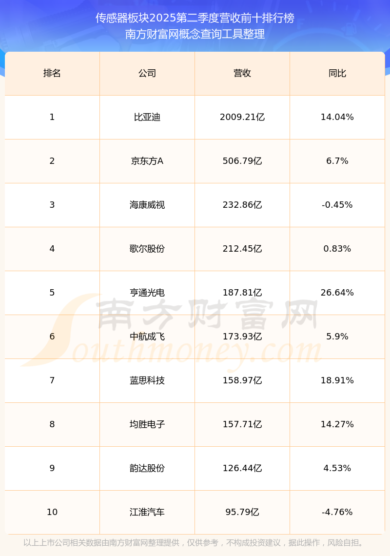 按照南方财富网概念查询工具统计,该股所属板块为传感器板块,该板块共有173只股票,高华科技2025第二季度营收在该板块中排名为第156名,该板块2025第二季度营收排名前十的股票如下表: