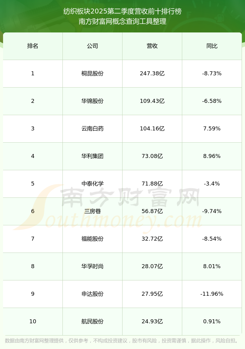 按照南方财富网概念查询工具统计,该股所属板块为纺织板块,该板块共有100只股票,华升股份2025第二季度营收在该板块中排名为第79名,该板块2025第二季度营收排名前十的股票如下表: