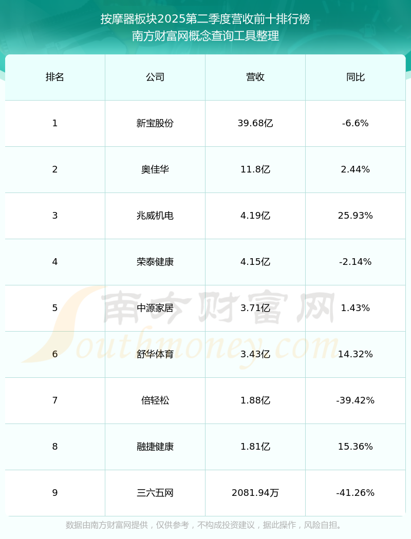 按照南方财富网概念查询工具统计,该股所属板块为按摩器板块,该板块共有9只股票,倍轻松2025第二季度营收在该板块中排名为第7名,该板块2025第二季度营收排名前十的股票如下表:
