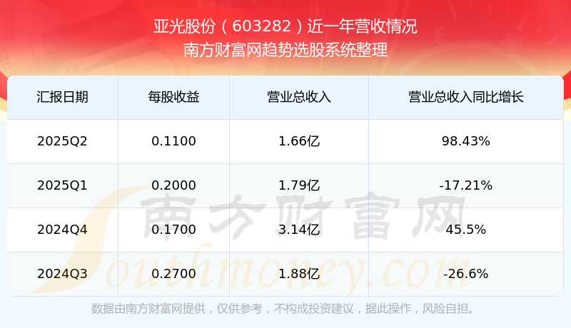 2025年第二季度,亚光股份营收同比98.43%,净利润同比3596.54%。