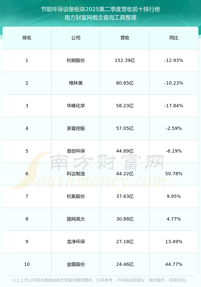 按照南方财富网概念查询工具统计,该股所属板块为节能环保设备板块,该板块共有51只股票,亚光股份2025第二季度营收在该板块中排名为第51名,该板块2025第二季度营收排名前十的股票如下表: