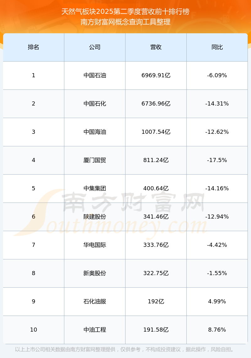 按照南方财富网概念查询工具统计,该股所属板块为天然气板块,该板块共有154只股票,贵州燃气2025第二季度营收在该板块中排名为第59名,该板块2025第二季度营收排名前十的股票如下表:
