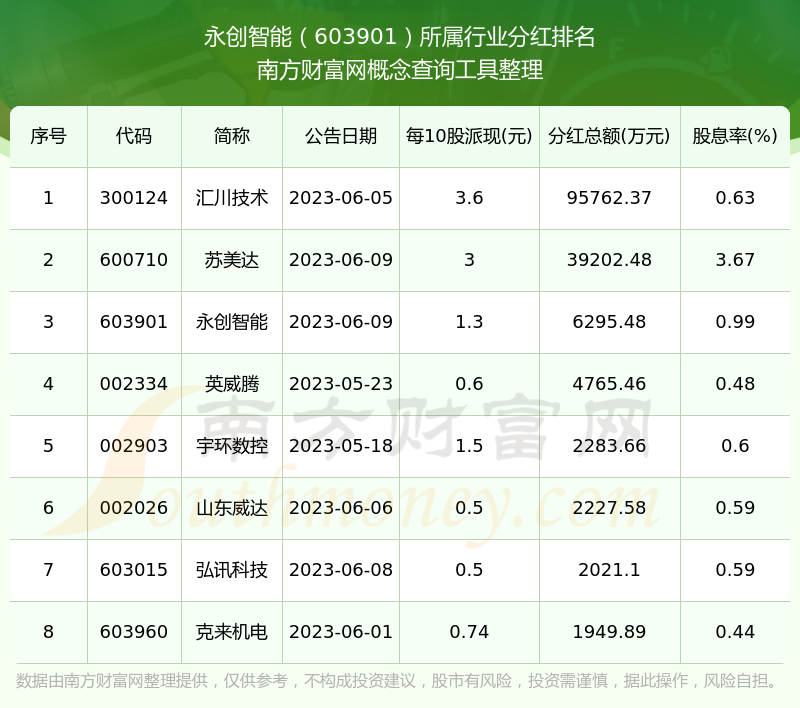 按照南方财富网趋势选股系统统计,永创智能所属行业为包装设备行业,包装设备行业分红排名情况如下表: