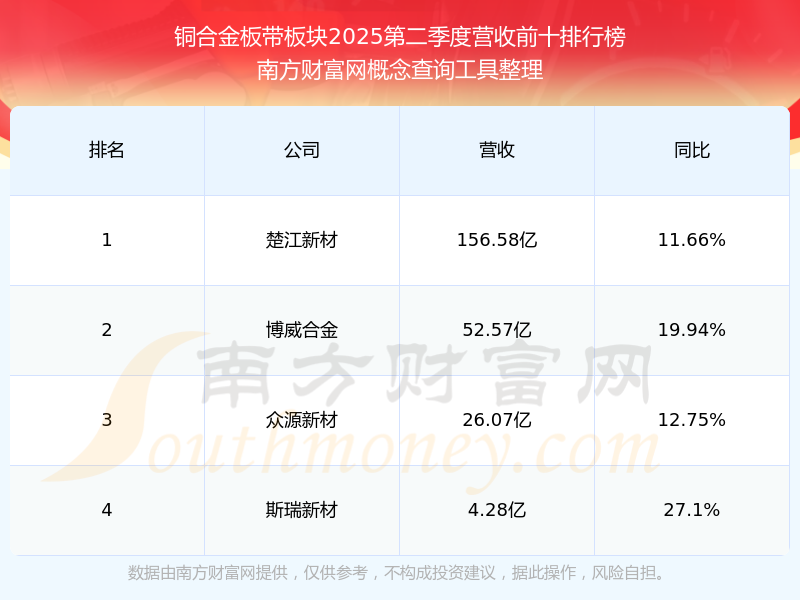 按照南方财富网概念查询工具统计,该股所属板块为铜合金板带板块,该板块共有4只股票,鑫科材料2025第二季度营收在该板块中排名为第4名,该板块2025第二季度营收排名前十的股票如下表: