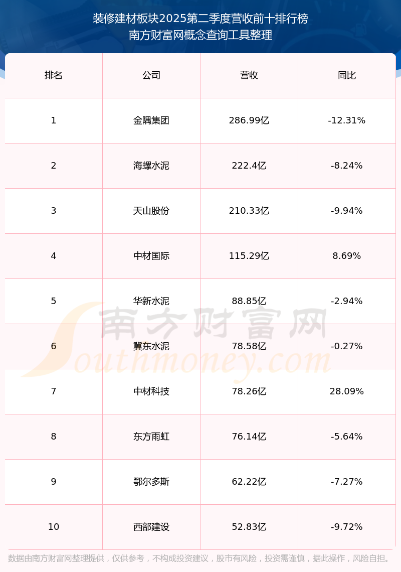 按照南方财富网概念查询工具统计,该股所属板块为装修建材板块,该板块共有82只股票,中源家居2025第二季度营收在该板块中排名为第82名,该板块2025第二季度营收排名前十的股票如下表: