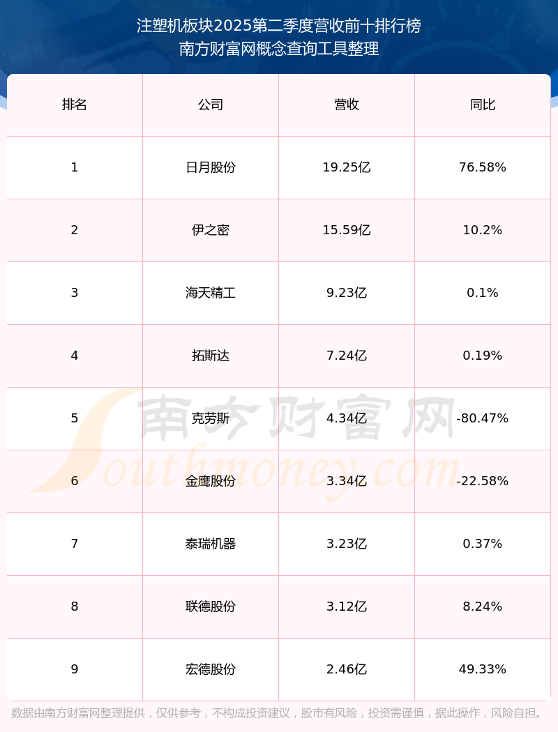 按照南方财富网概念查询工具统计,该股所属板块为注塑机板块,该板块共有9只股票,金鹰股份2025第二季度营收在该板块中排名为第6名,该板块2025第二季度营收排名前十的股票如下表: