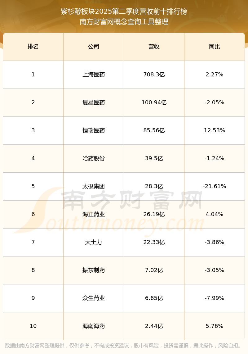 按照南方财富网概念查询工具统计,该股所属板块为紫杉醇板块,该板块共有18只股票,上海谊众2025第二季度营收在该板块中排名为第16名,该板块2025第二季度营收排名前十的股票如下表:
