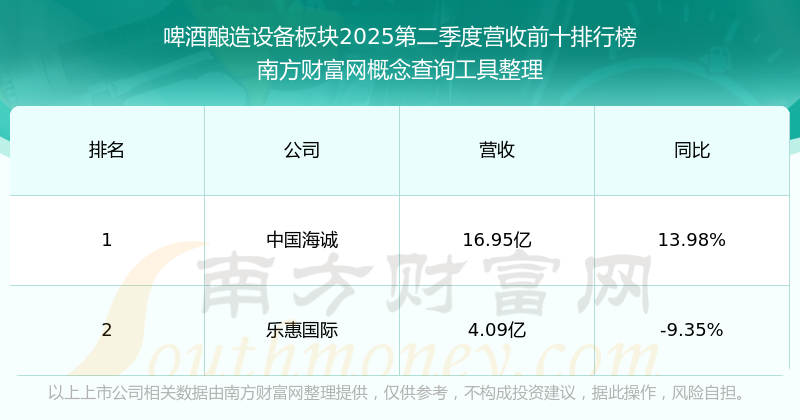 按照南方财富网概念查询工具统计,该股所属板块为啤酒酿造设备板块,该板块共有2只股票,乐惠国际2025第二季度营收在该板块中排名为第2名,该板块2025第二季度营收排名前十的股票如下表: