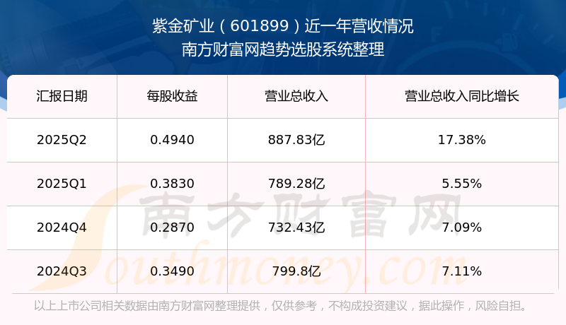 紫金矿业股票近一年营收情况如下表: