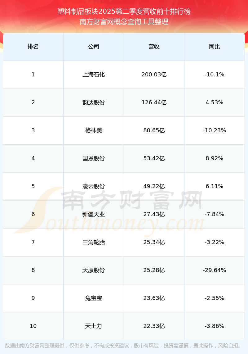 按照南方财富网概念查询工具统计,该股所属板块为塑料制品板块,该板块共有77只股票,至正股份2025第二季度营收在该板块中排名为第77名,该板块2025第二季度营收排名前十的股票如下表: