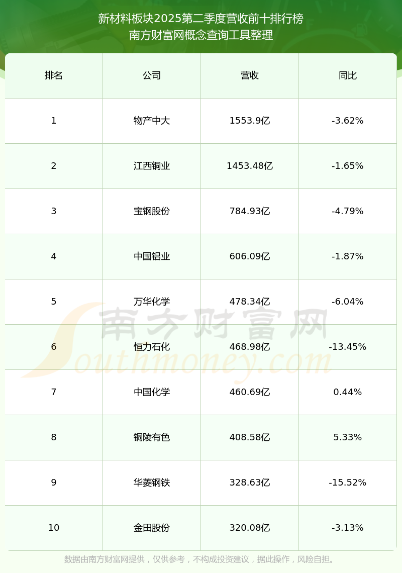 按照南方财富网概念查询工具统计,该股所属板块为新材料板块,该板块共有559只股票,北方稀土2025第二季度营收在该板块中排名为第39名,该板块2025第二季度营收排名前十的股票如下表: